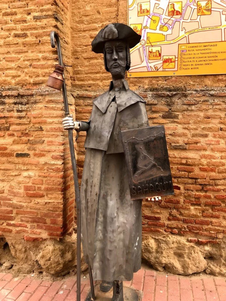 We would be walking through one big town today, Sahagun. As we left the Hobbit Village, the path looked like any other day along the Camino. Starting with a Santiago sign.
