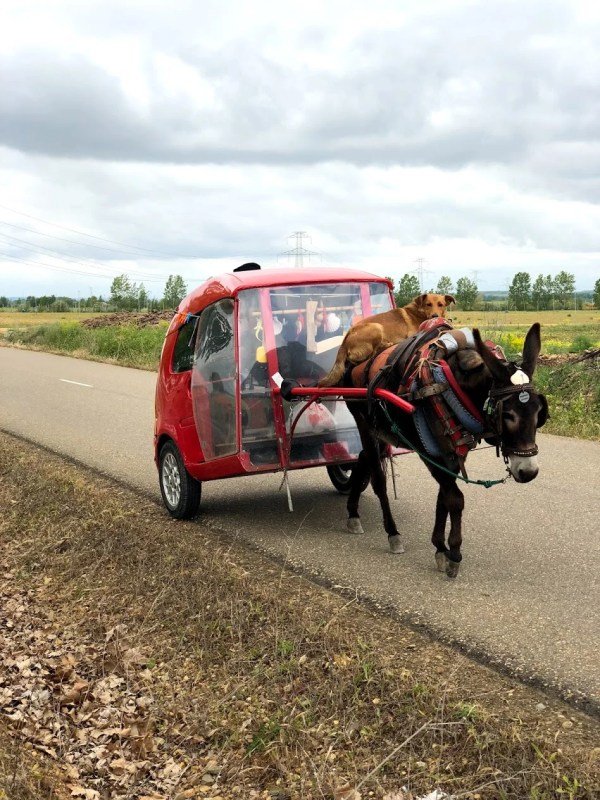 Up ahead on the road, we saw something odd, we kept waiting for it to get closer. It was a little red cart, being pulled by a donkey but on the donkey was a dog. I promise just look at the picture below.