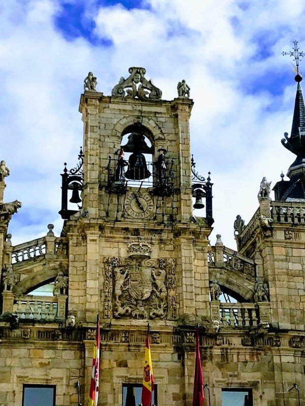 On the façade of the building, we find several decorative architectural elements, highlighting in the central top, both the royal coat of arms and the clockwork master watchmaker Bernardo Franco, on the sides of the clock are the maragatos Juan Zancuda and Colasa, since 1748 these automatons figures dressed in the typical regional dress that at each hour sharp move telling time by making the clock bell sound with a mallet. Source: https://turismoastorga.es/town-hall/
