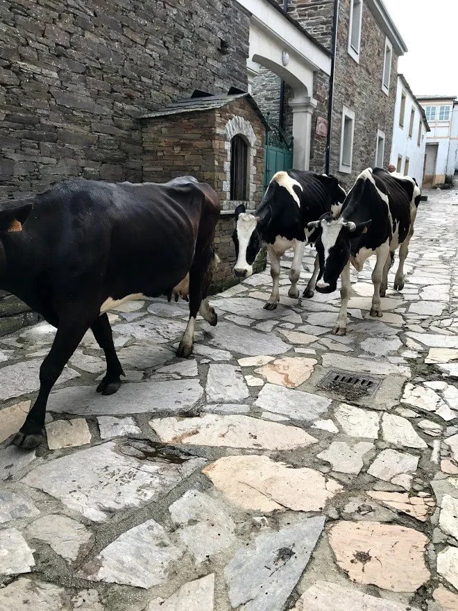 As we were eating outside the café, the tables were basically on the road. Only one car could fit through the narrow path, a farmer arrived with her cattle.